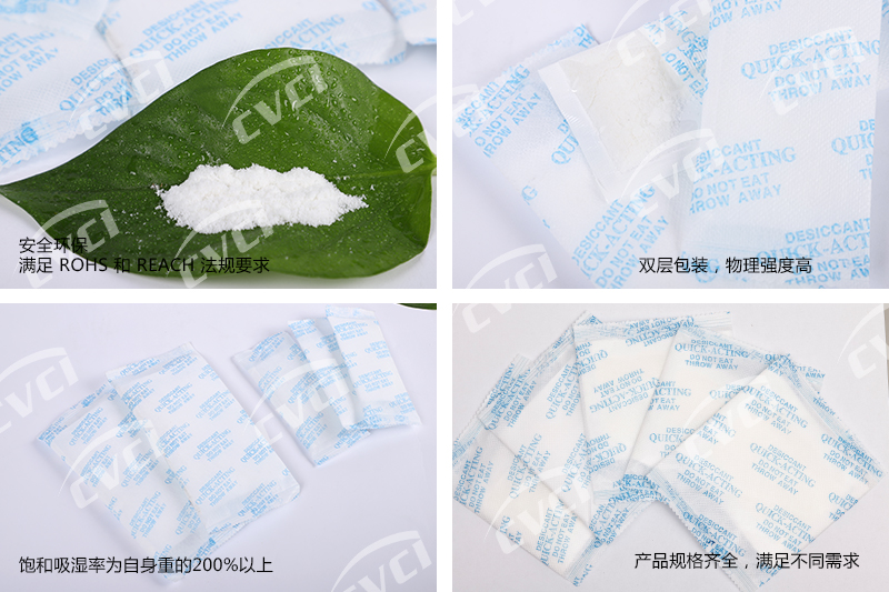 速效干燥劑是以高效活性吸附物為原料,經(jīng)精確計算,科學調配后組成。包裝采用杜邦紙與高級無紡布雙層包裝,印刷精美,使用方便。該產(chǎn)品規(guī)格齊全,可滿足不同產(chǎn)品的防潮、防銹包裝需求。